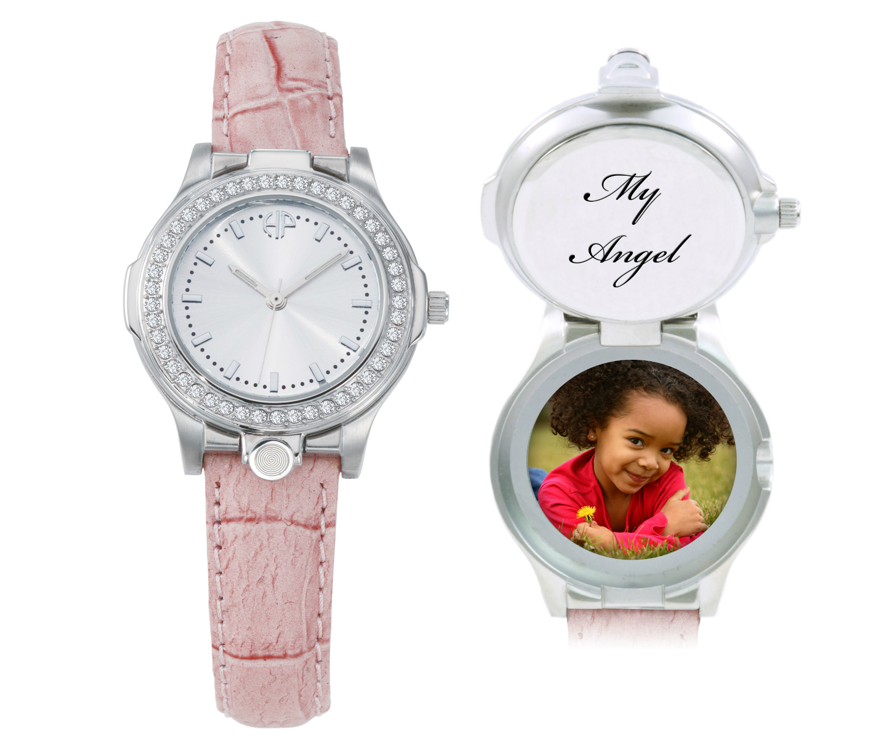 This stainless steel pink leather strap woman's picture watch with a silver dial surrounded by a crystal decor bezel.